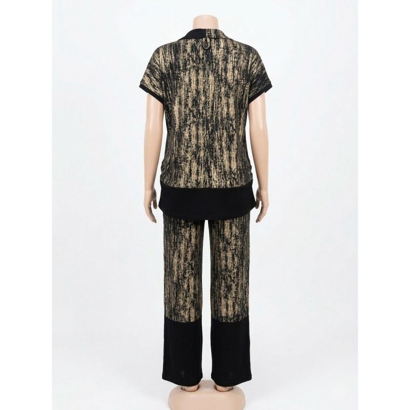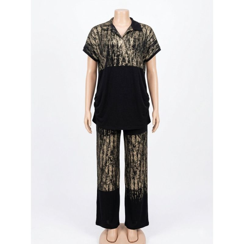 Black and Gold Distressed Print Short-Sleeve Polo Top and Trousers Set