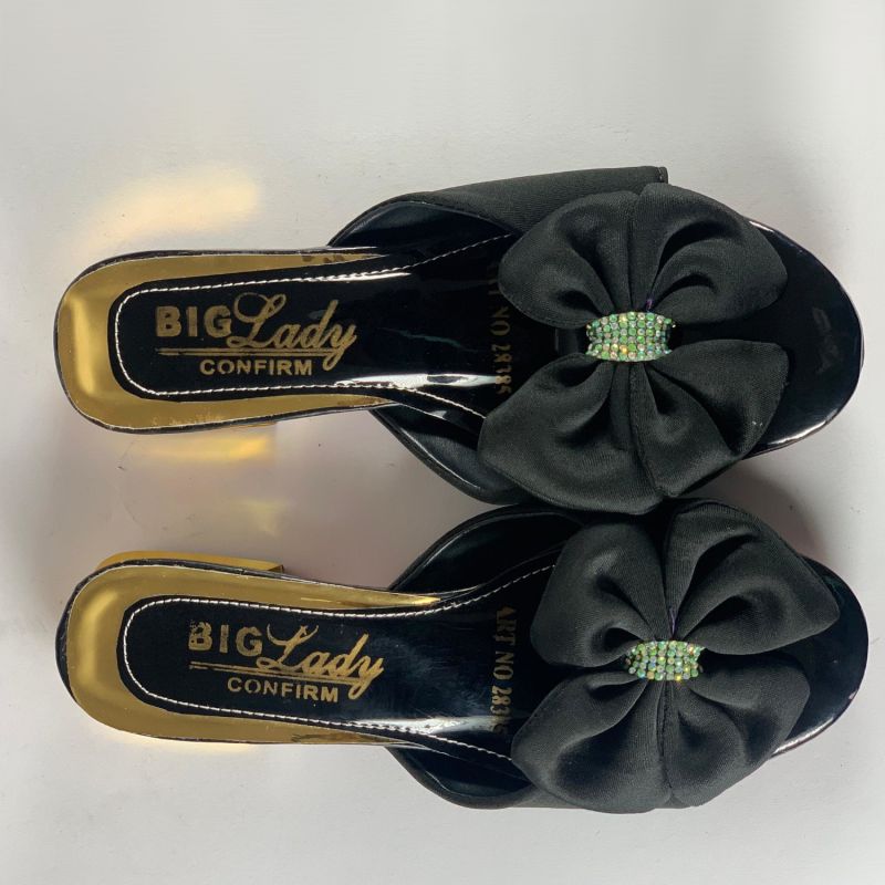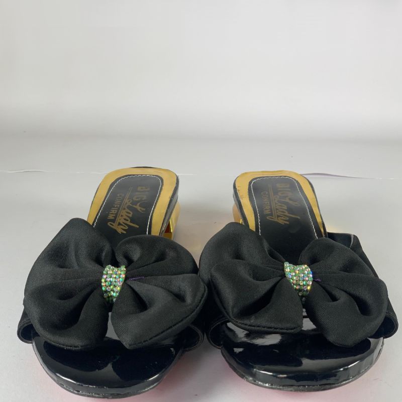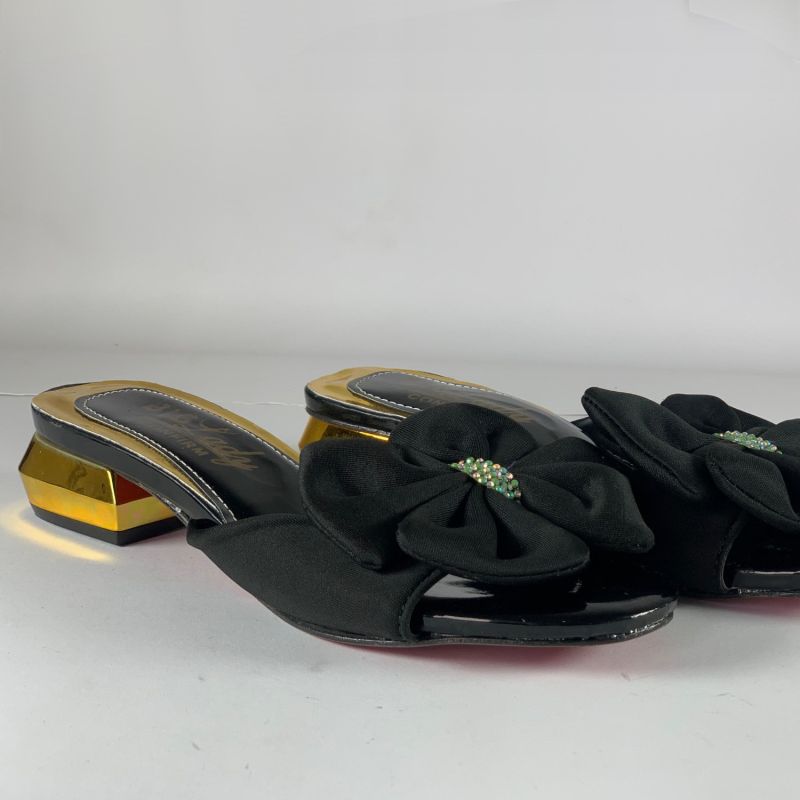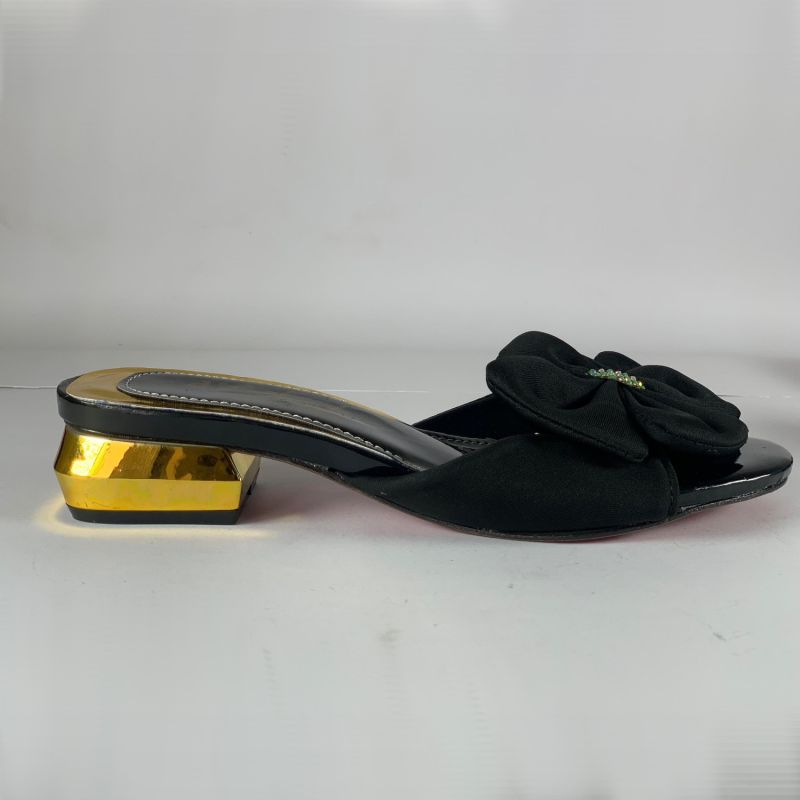 Black and gold low heels ladies shoes with flower design top