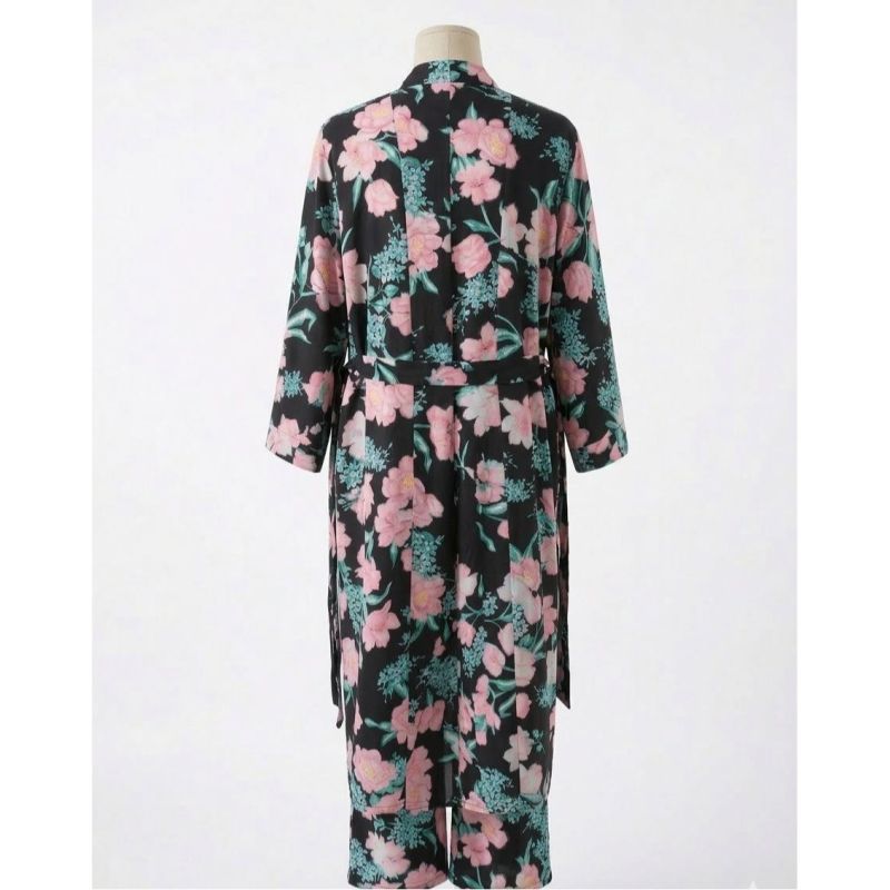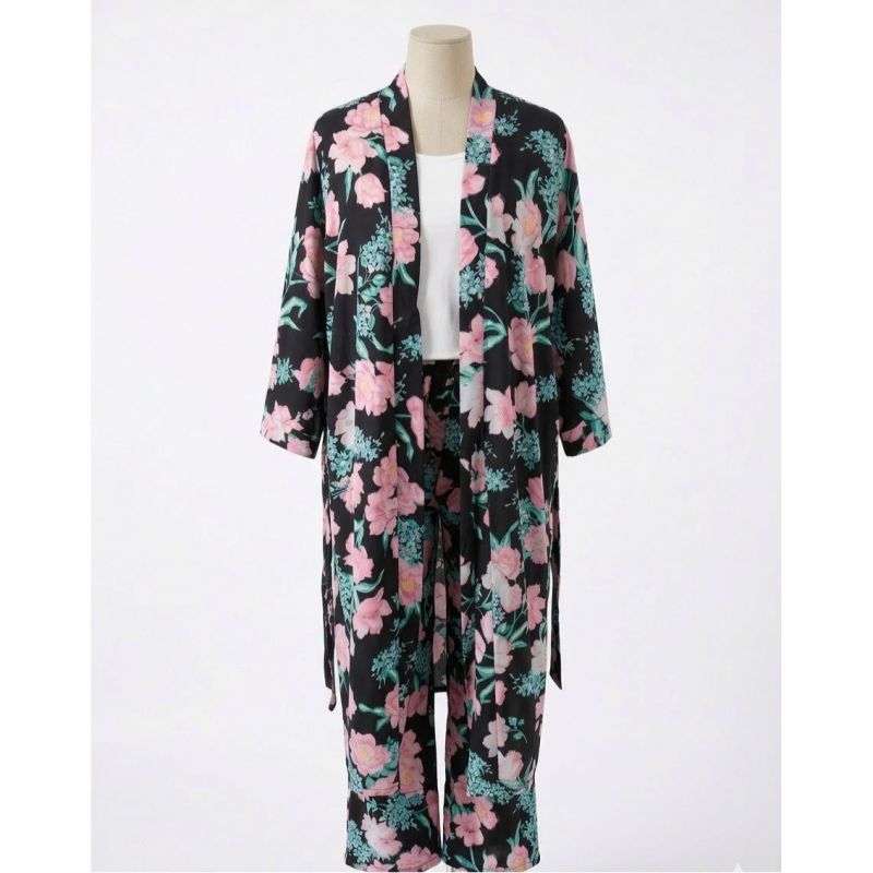 Black Floral Print Open-Front Kimono Cardigan and Trousers Set