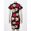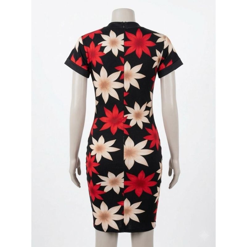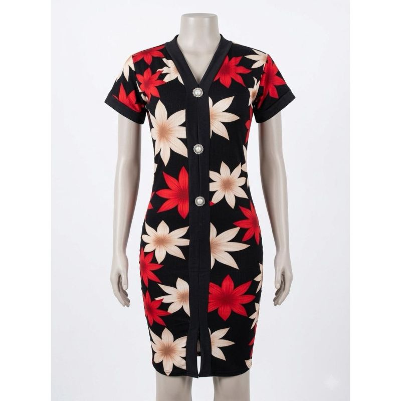 Black Floral Print Short-Sleeve Midi Dress with Decorative Buttons