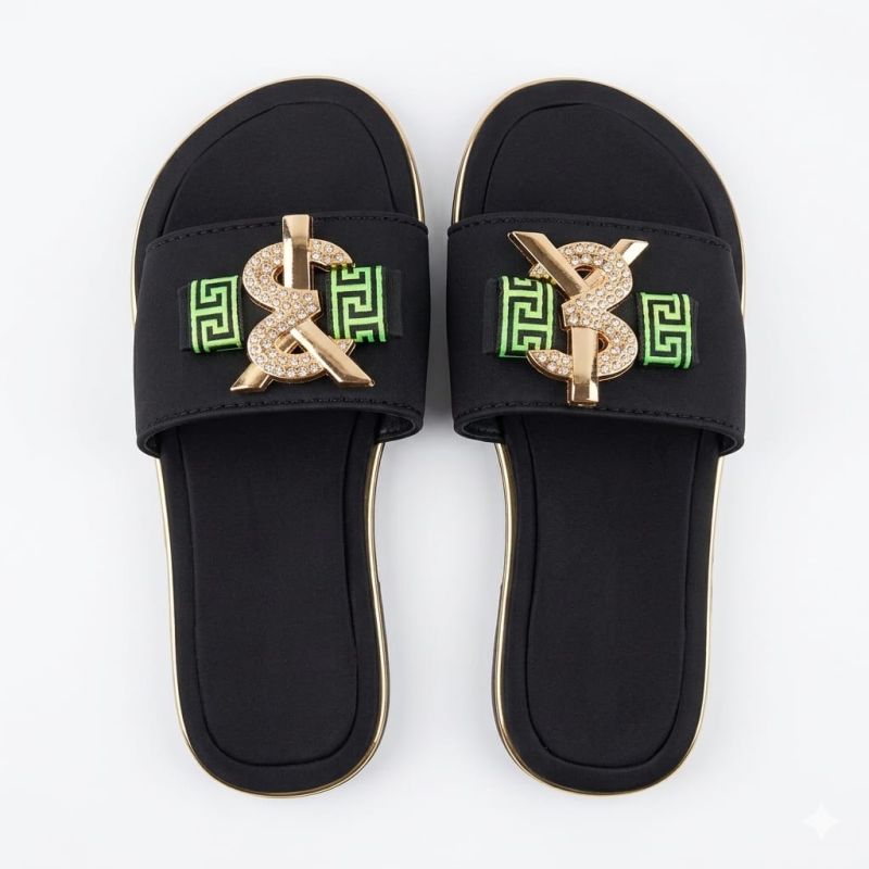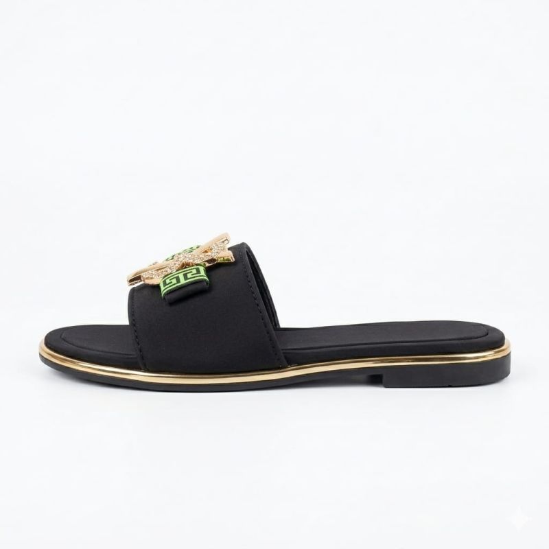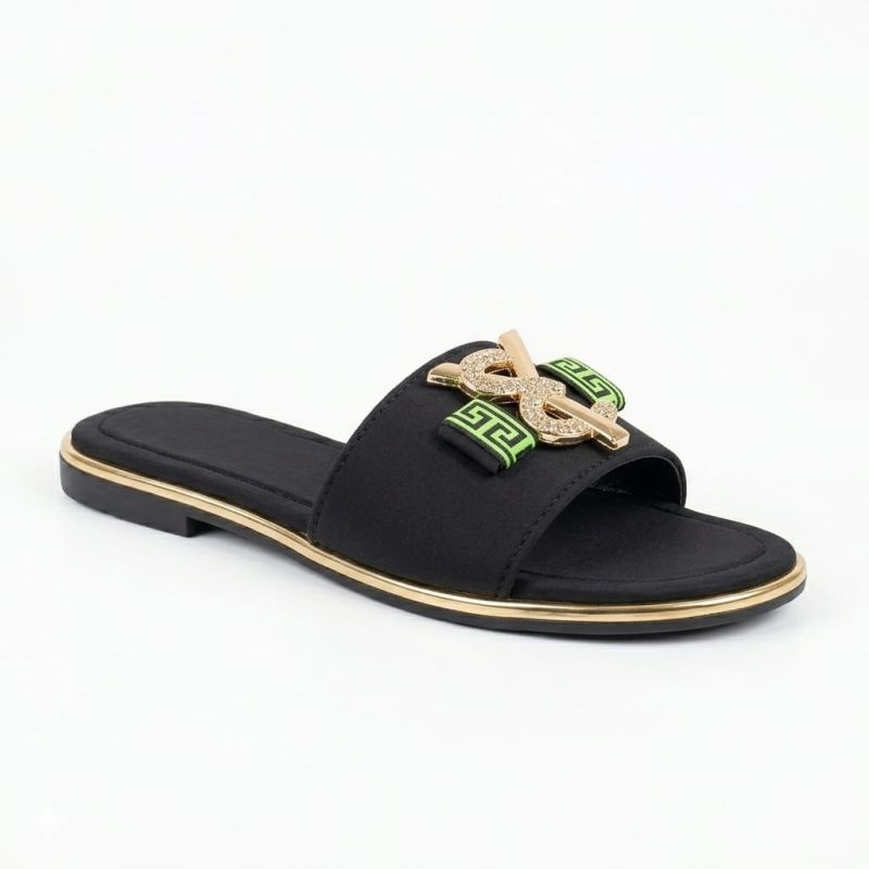 Black ladies flat slippers with fancy