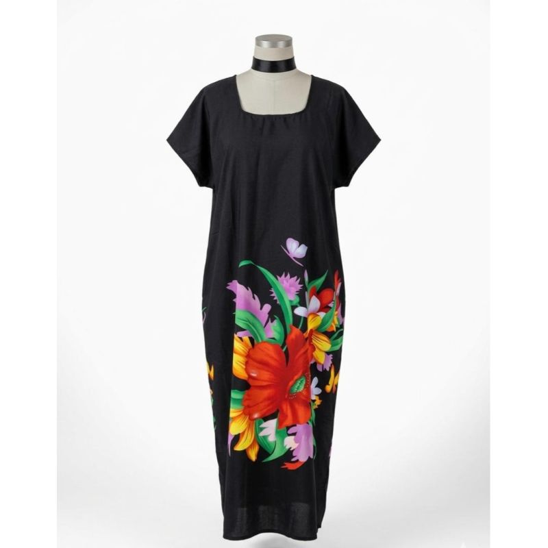 Black Short-Sleeve Square-Neck Maxi Dress with Vibrant Tropical Floral Print