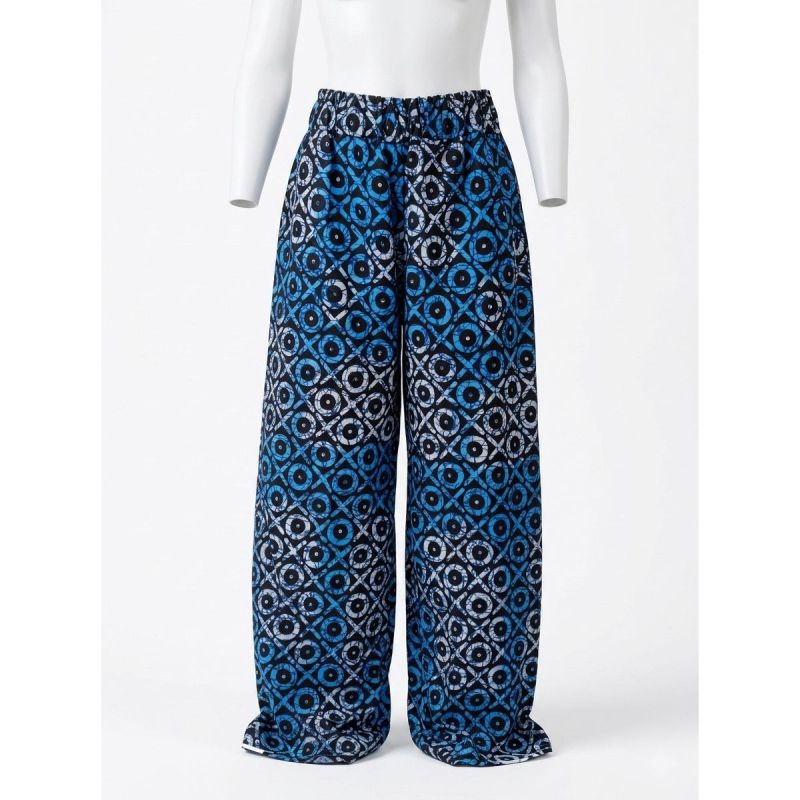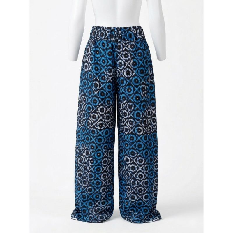 Blue and Black Circular Geometric Print Wide-Leg Pants
