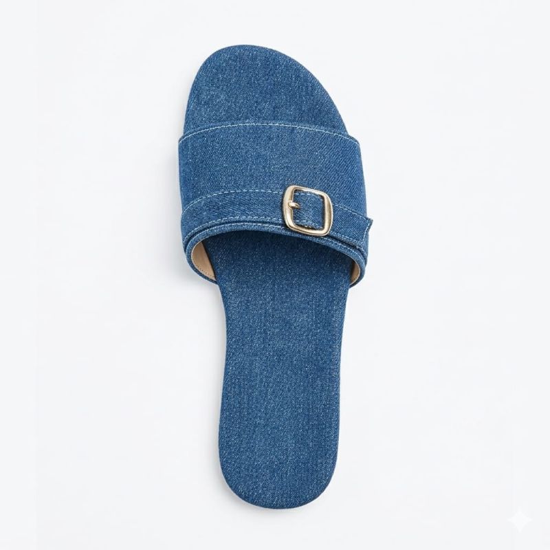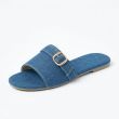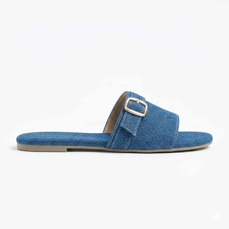 Blue jean material used for ladies flat slippers with buckle design