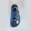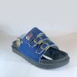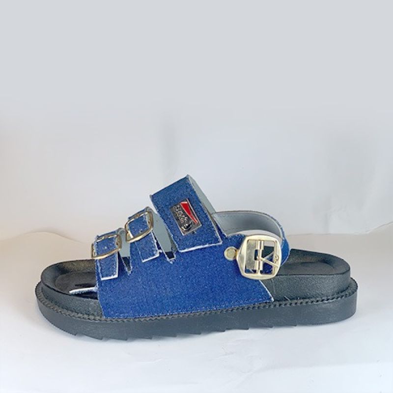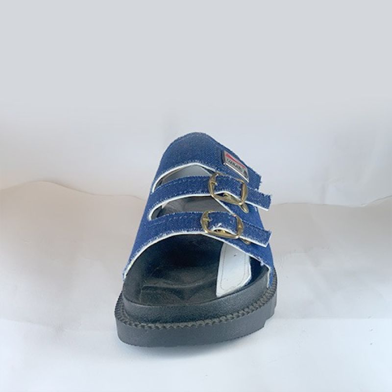 Blue jean slippers with black sole and 3 buckles