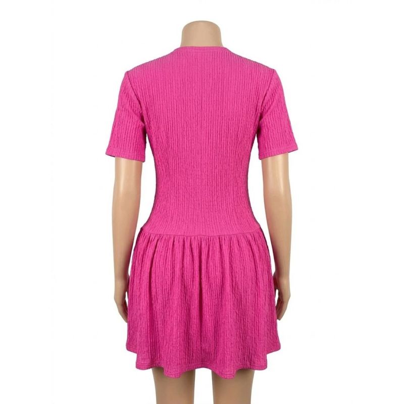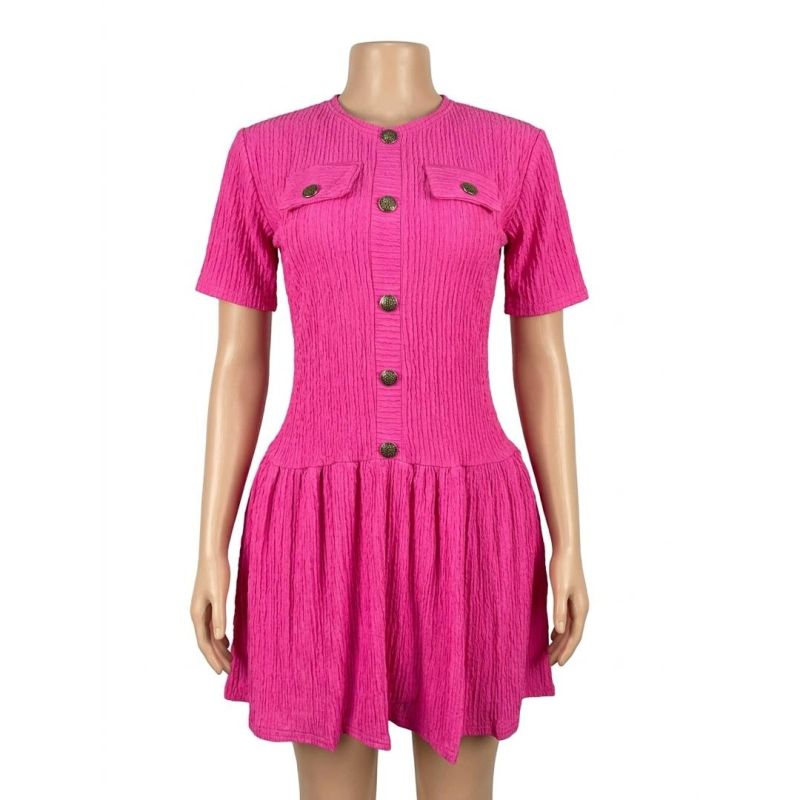 Bright Pink Textured Short-Sleeve Mini Dress with Decorative Buttons and Pockets