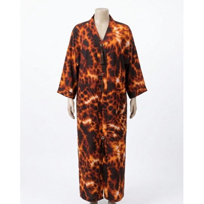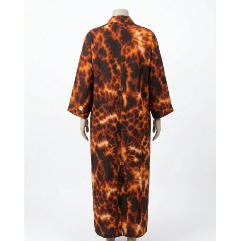Brown and Orange Fireburst Tie-Dye Maxi Caftan with Tassel Detail