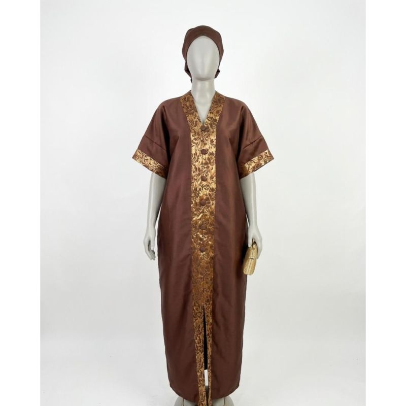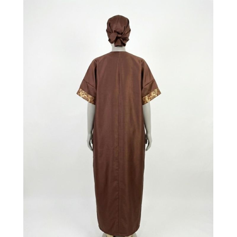 Brown Short-Sleeve Caftan with Gold Patterned Trim and Matching Headwrap