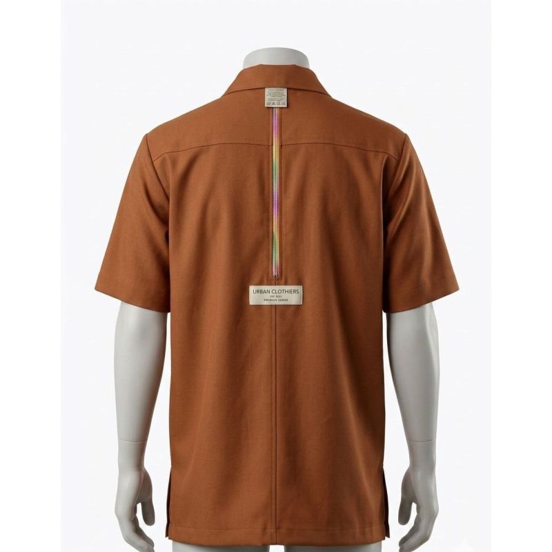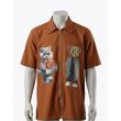 Brown Short-Sleeve Zip-Up Shirt with Cat and Teddy Bear Graphics