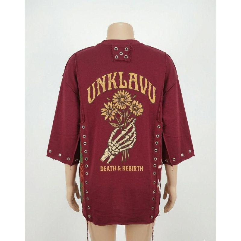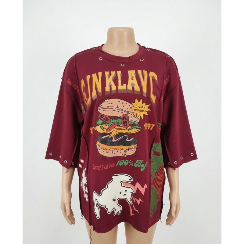 Burgundy Distressed Oversized T-Shirt with Burger and "UNKLAVC" Graphics and Metal Eyelet Trim