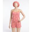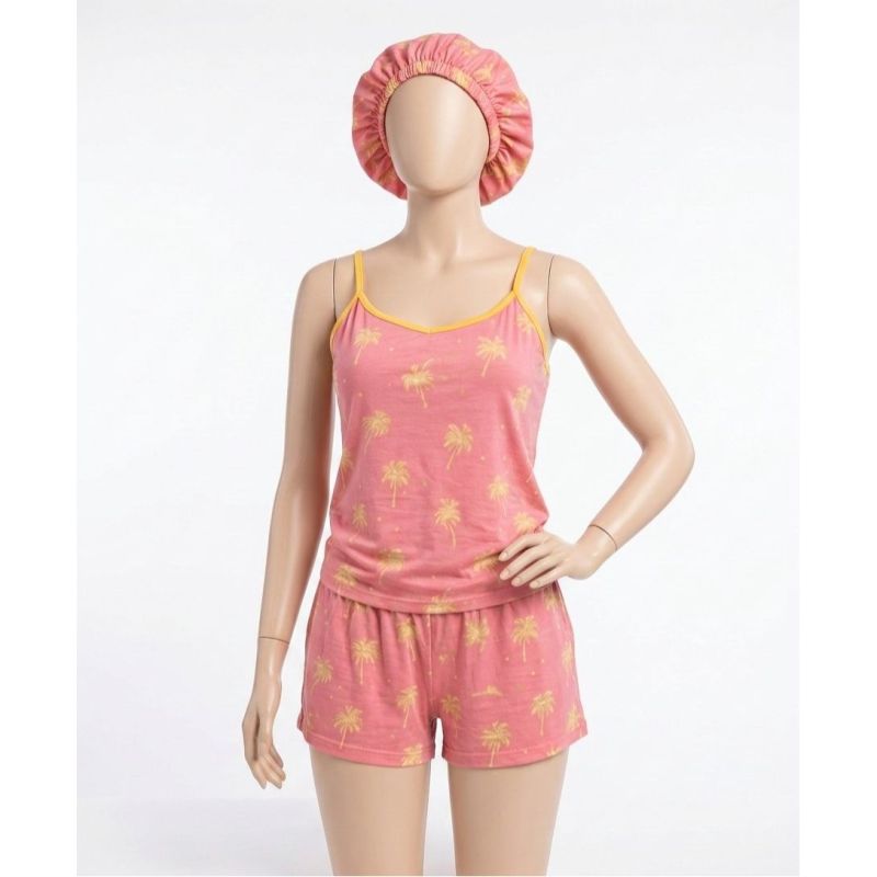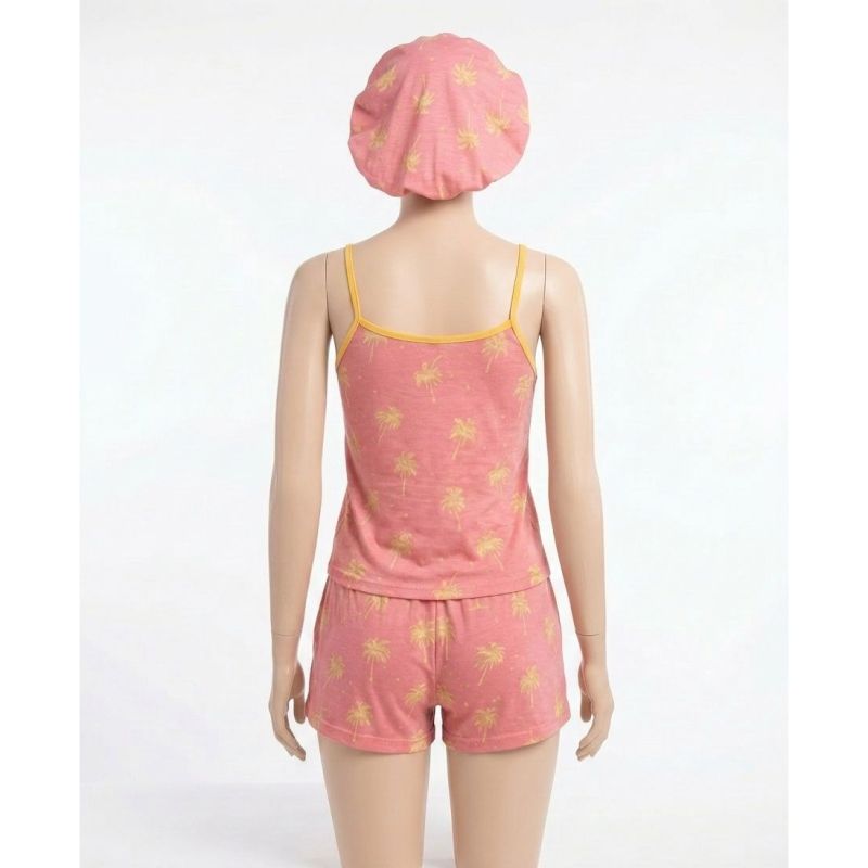 Coral Pink Palm Tree Print Cami Top, Shorts, and Matching Bonnet Pajama Set