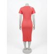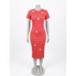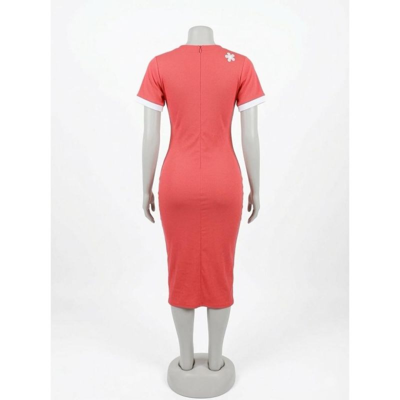Coral Short-Sleeve Midi Dress with Floral Appliques
