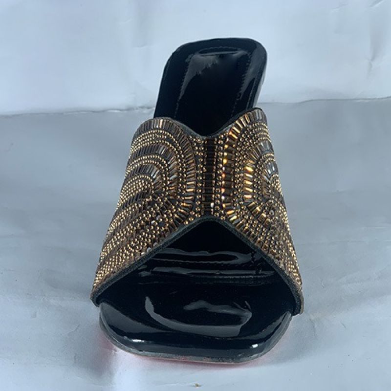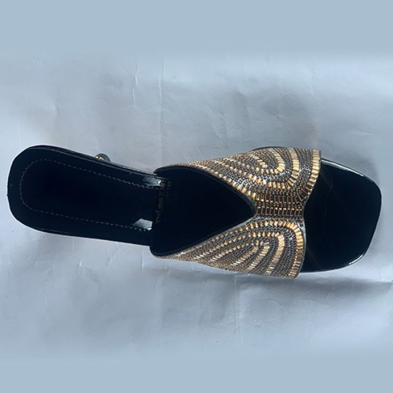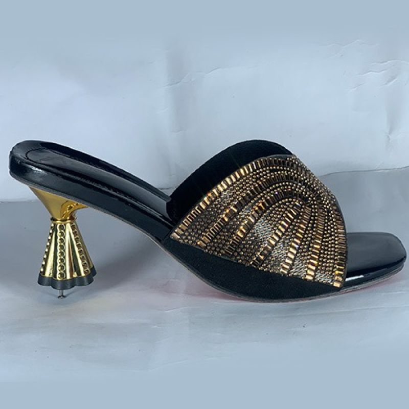 Ladies black slippers with golden heel