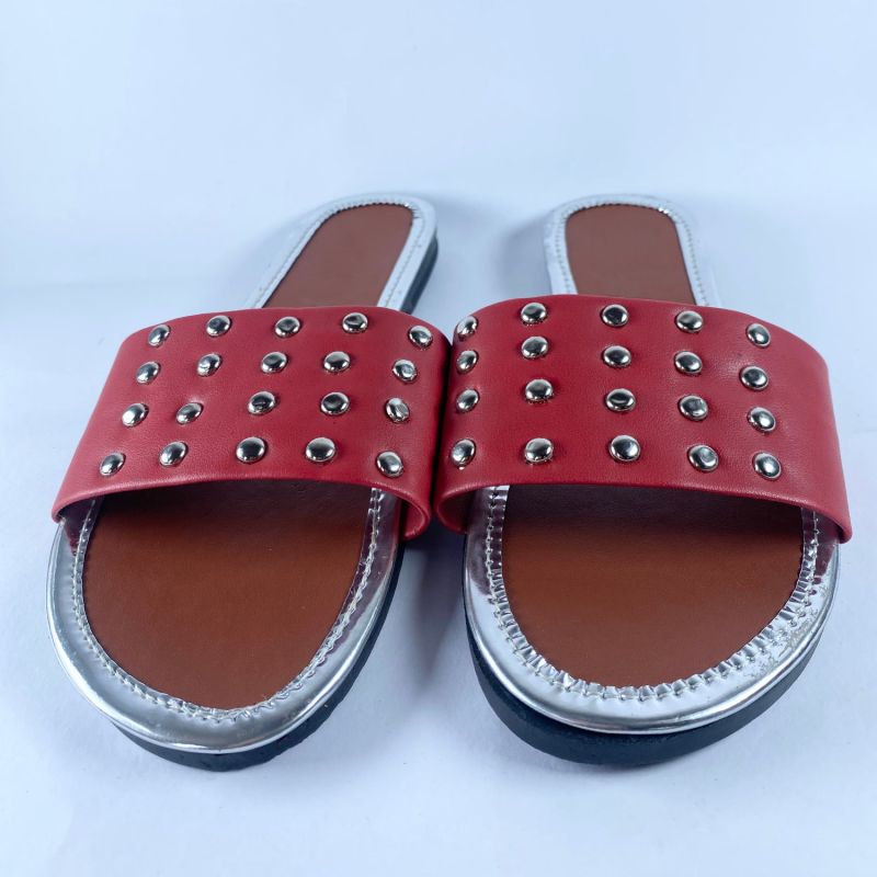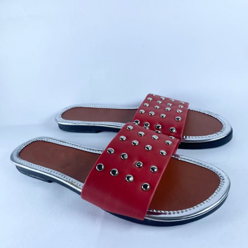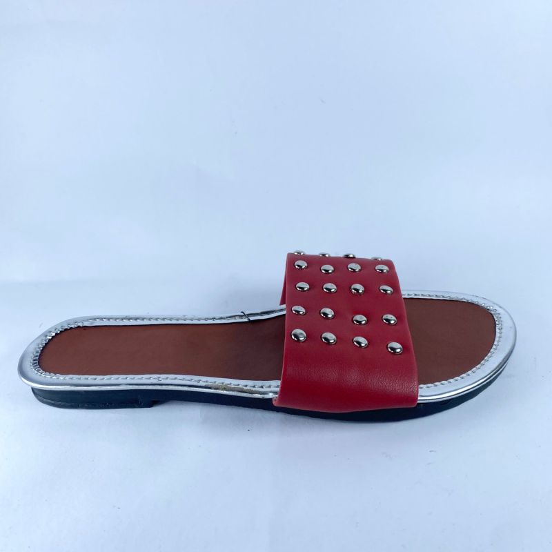 Ladies Flat Fashion Rivets Slides Slippers - Brown And Red