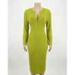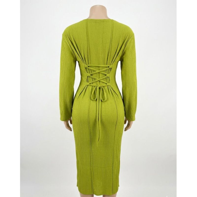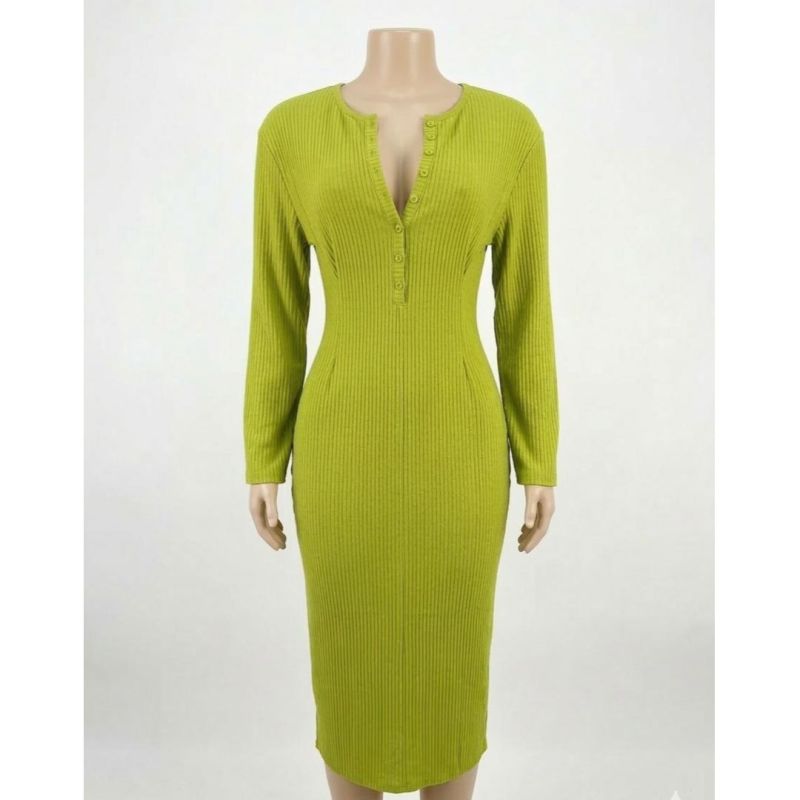 Lime Green Long-Sleeve Ribbed Bodycon Dress with Buttoned V-Neck