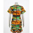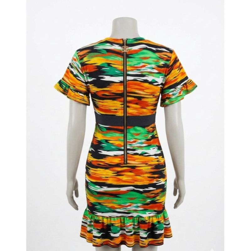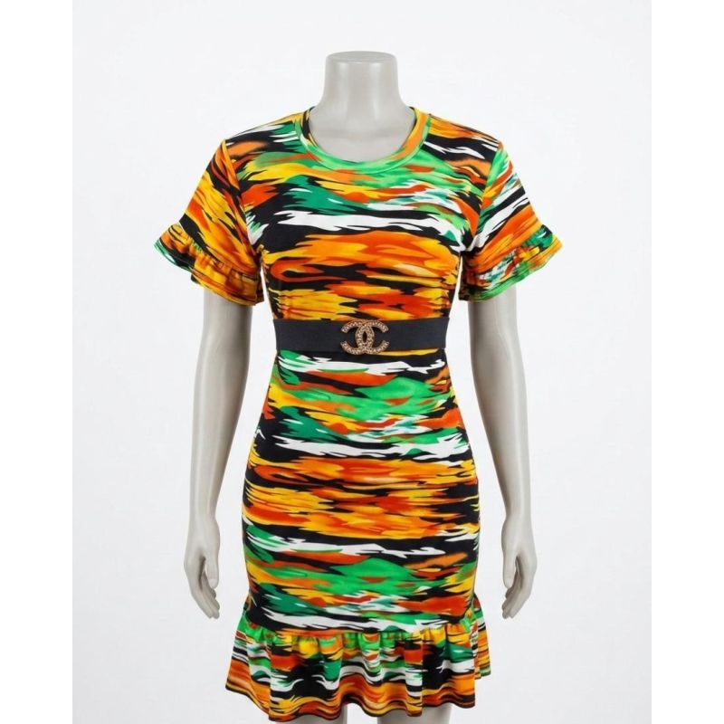 Multicolor Abstract Camo-Style Print Bodycon Dress with Belted Waist and Ruffle Hem