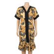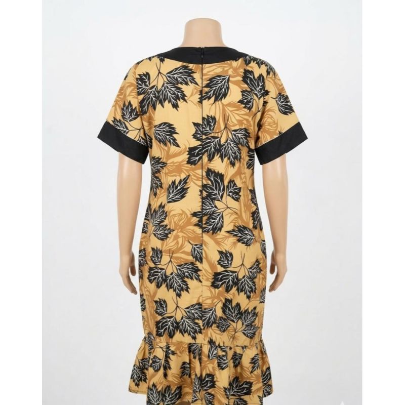 Mustard Leaf Print Midi Dress with Black Trim & Ruffle Hem