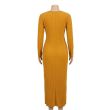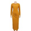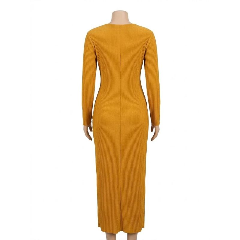 Mustard Yellow Long-Sleeve Ribbed Maxi Dress with Draped Skirt Detail