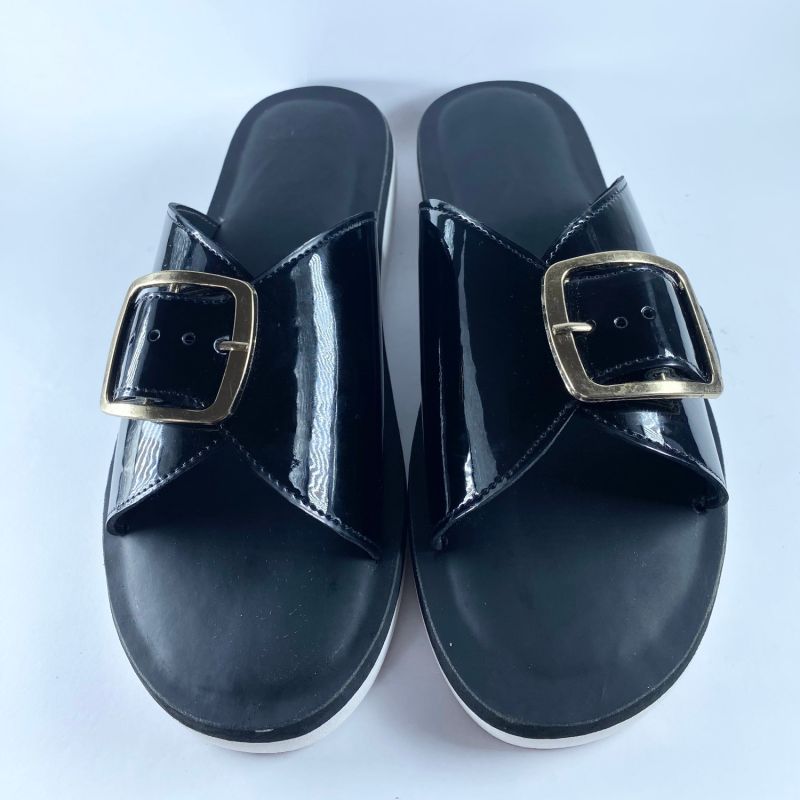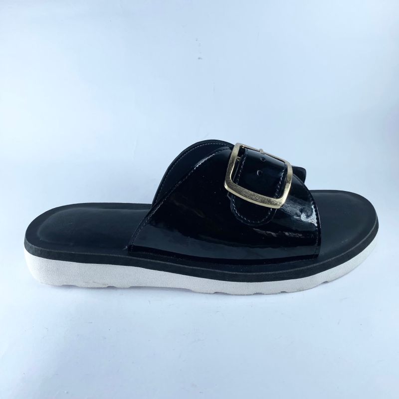 New Fashion Casual Square Buckle Plaid Round Toe Wedge Slippers - Black And White