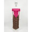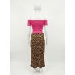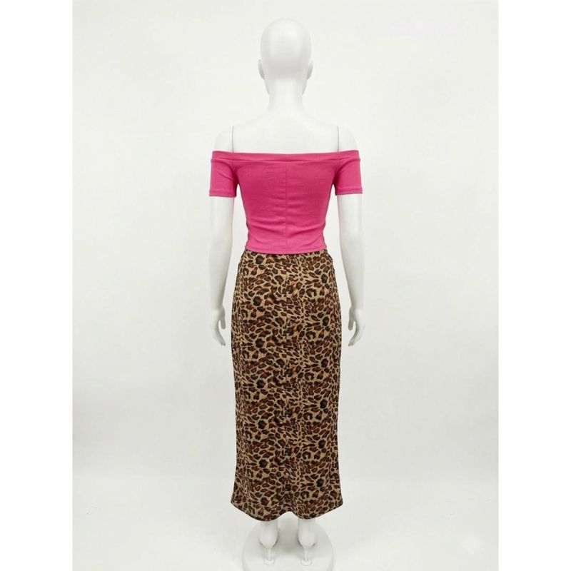 off-shoulder ruched top with a leopard print midi skirt