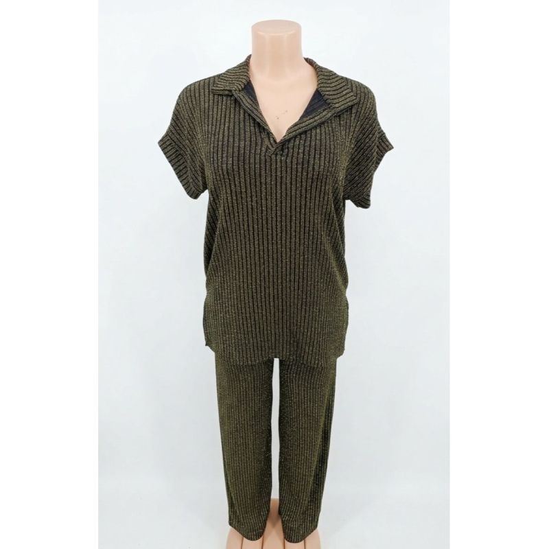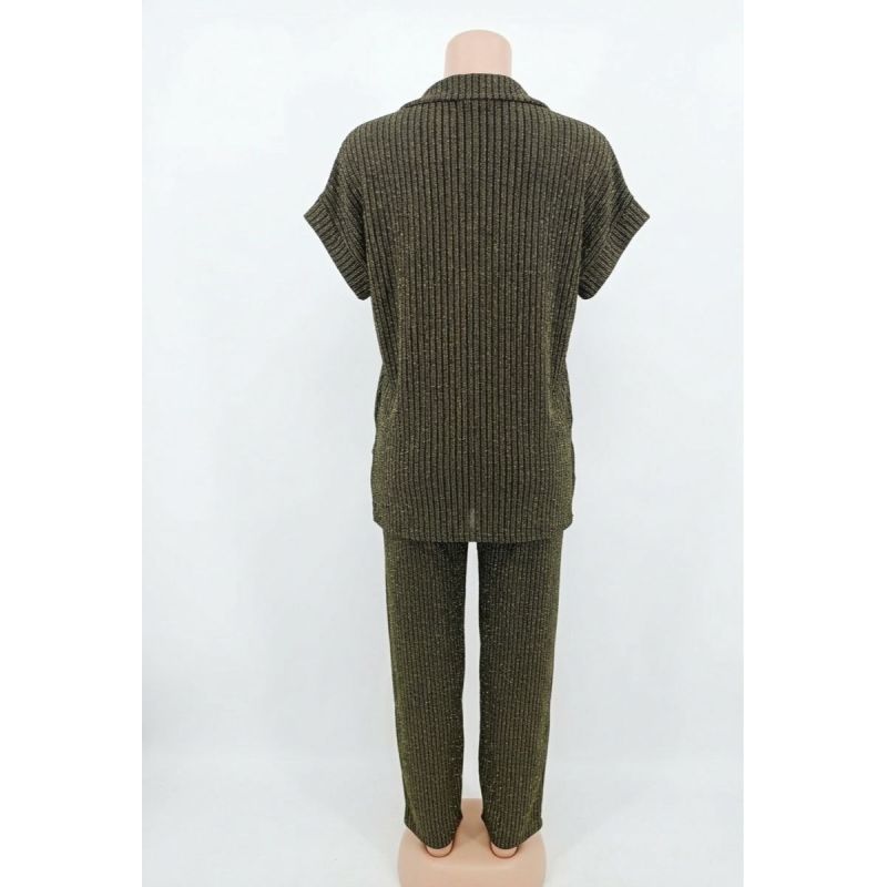 Olive Green and Black Metallic Ribbed Short-Sleeve Top and Trousers Set