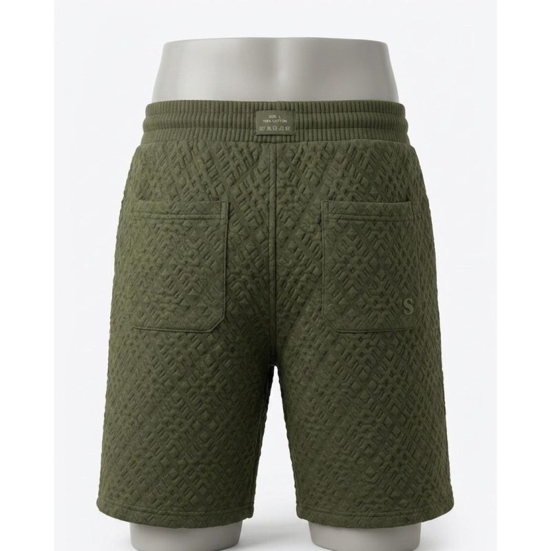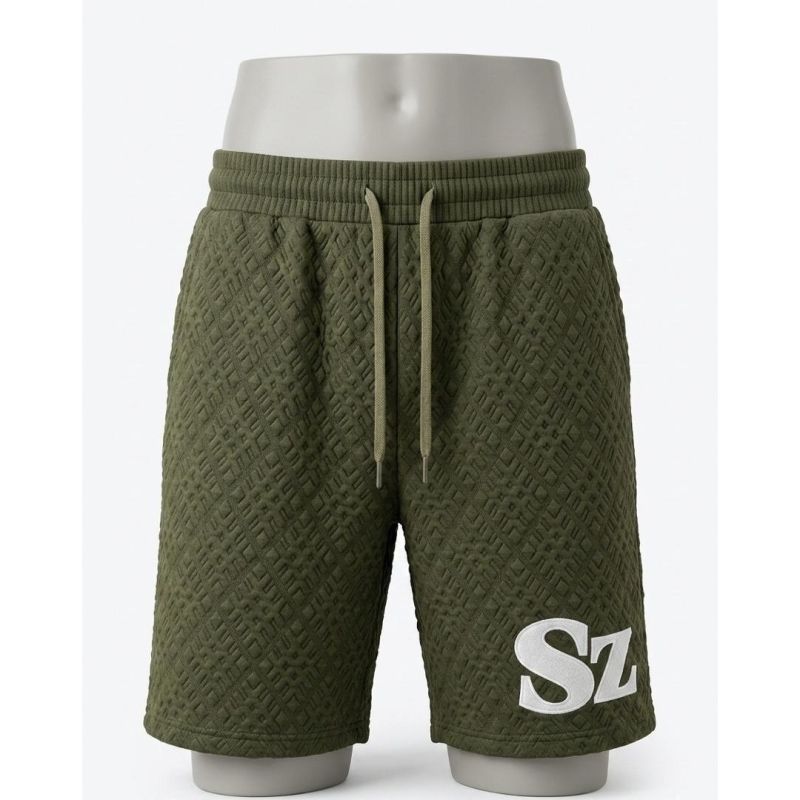 Olive Green Quilted Textured Drawstring Shorts with "SZ" Graphic