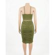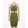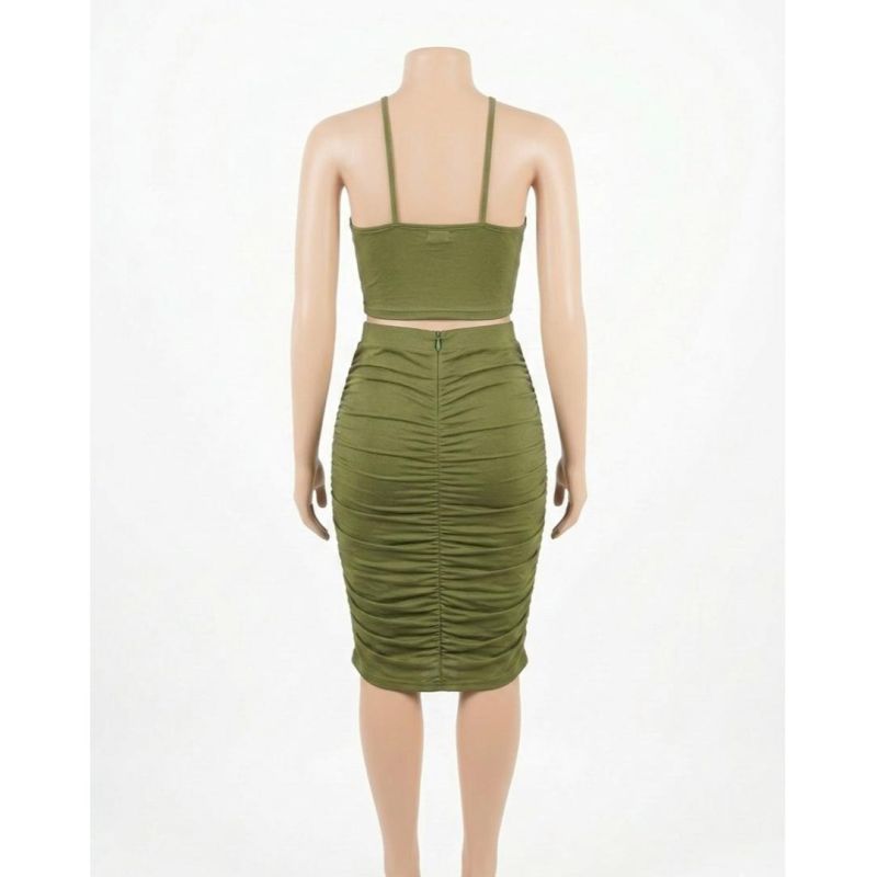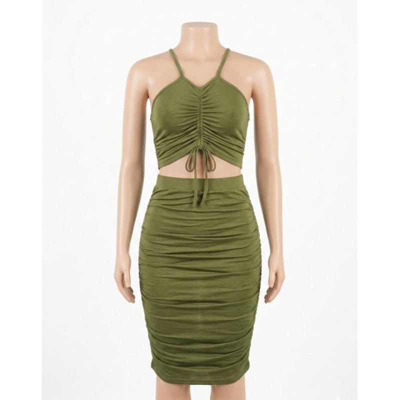 Olive Green Ruched Halter Crop Top and Bodycon Midi Skirt Set