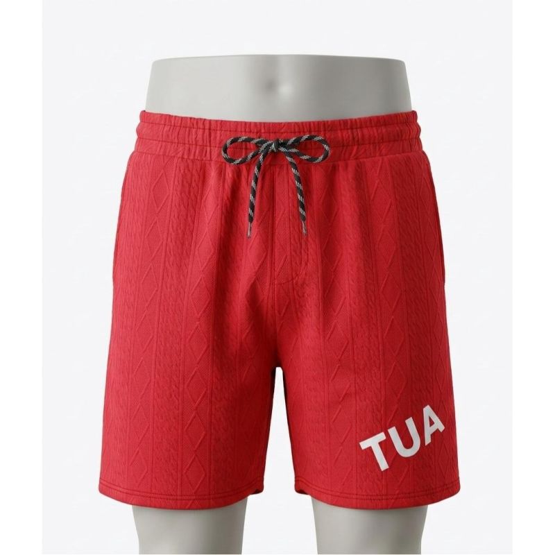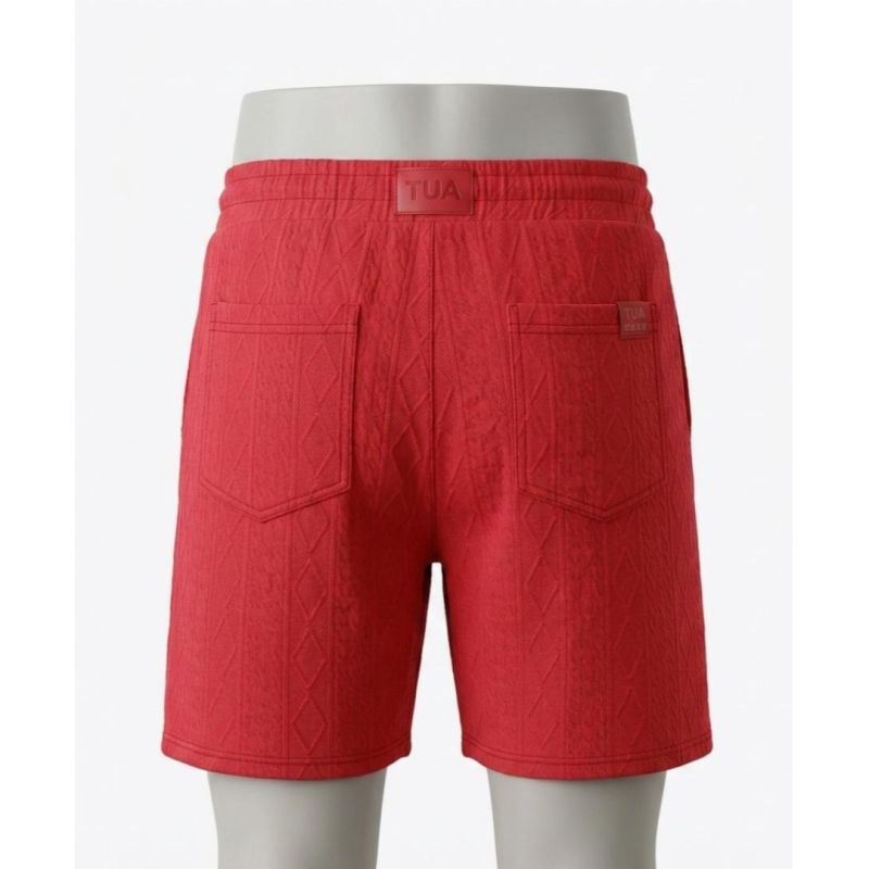 Red Cable-Knit Textured Drawstring Shorts with "TUA" Graphic