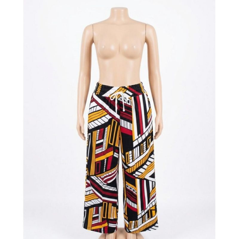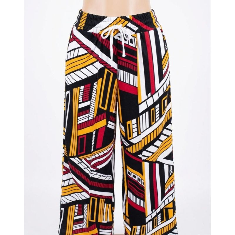 Red, Yellow, and Black Geometric Abstract Print Wide-Leg Drawstring Trousers
