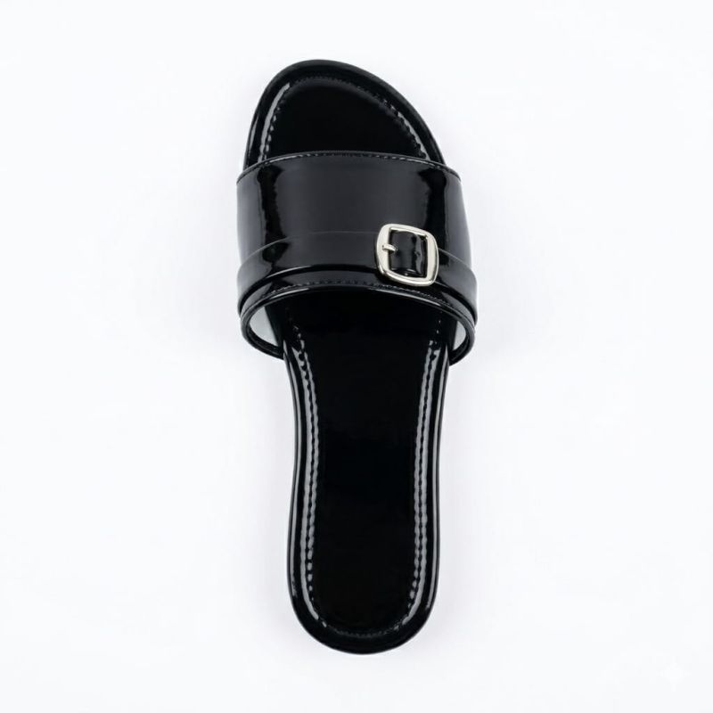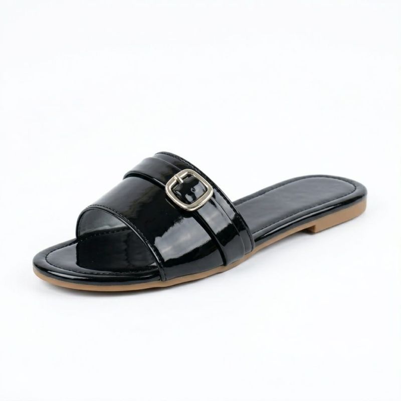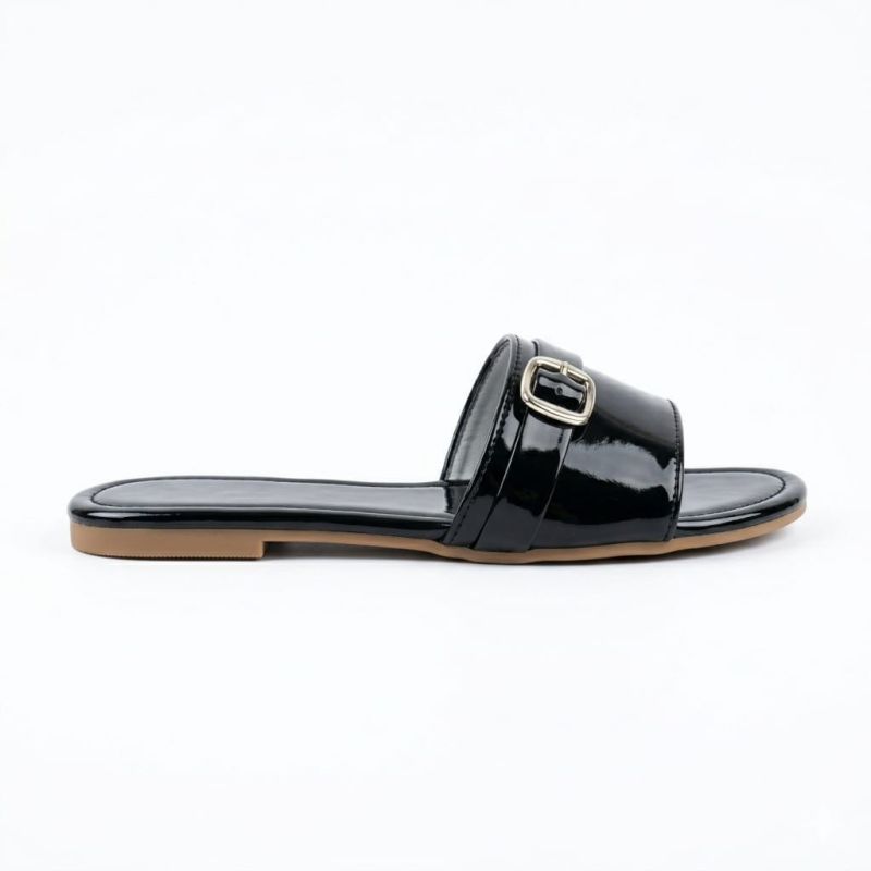 Shiny flat ladies black slippers with buckle design