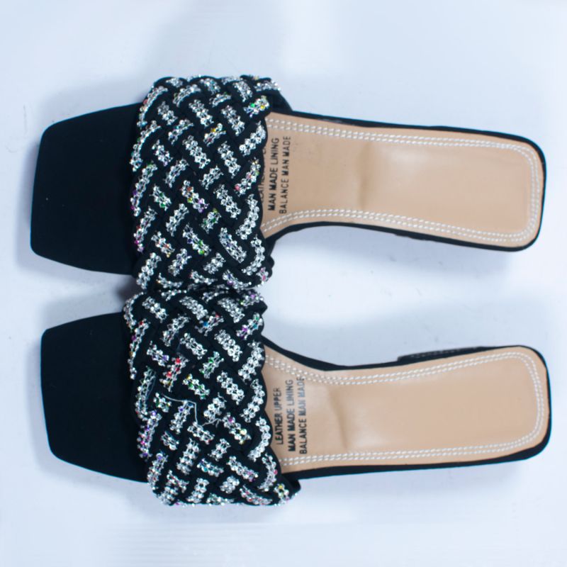 Square Toe Ladies Slipper - Low Heel Black And Silver Colour