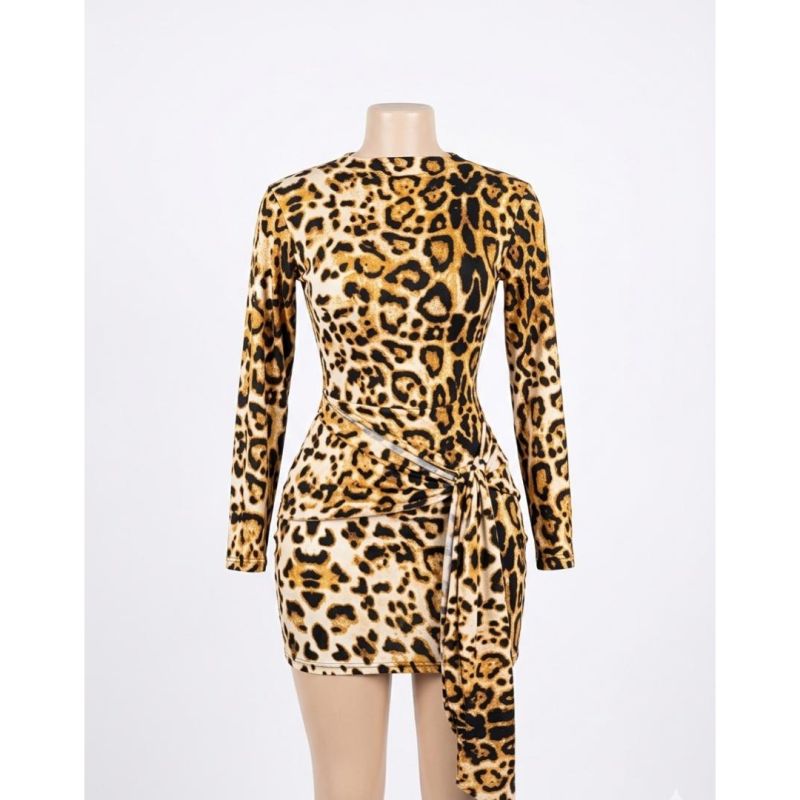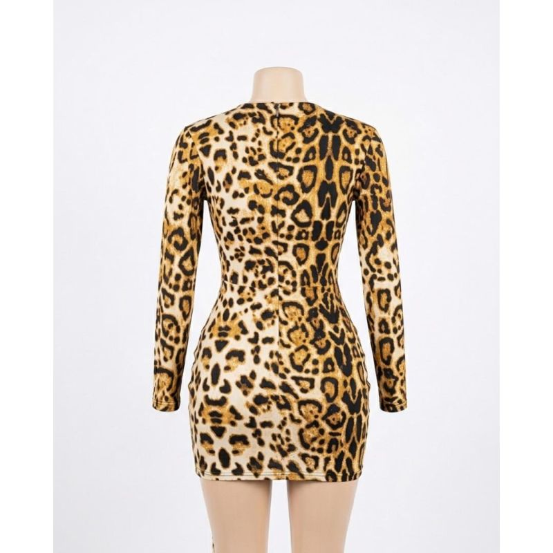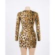 Tan and Black Leopard Print Long-Sleeve Bodycon Mini Dress