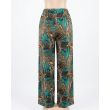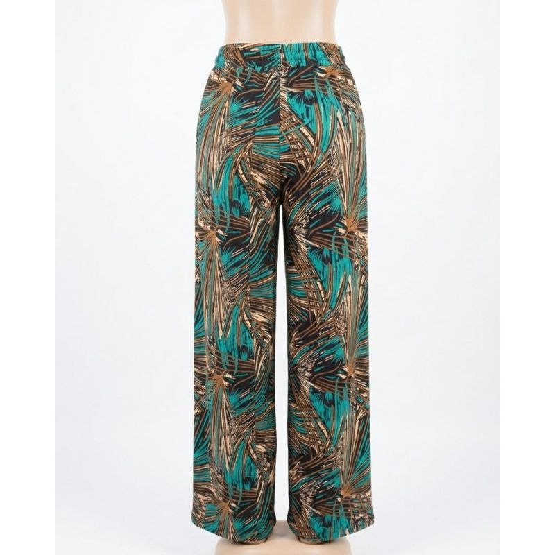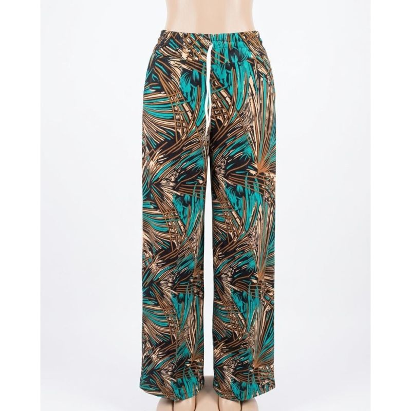 Teal and Tan Palm Leaf Print Wide-Leg Drawstring Trousers