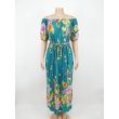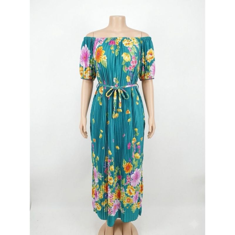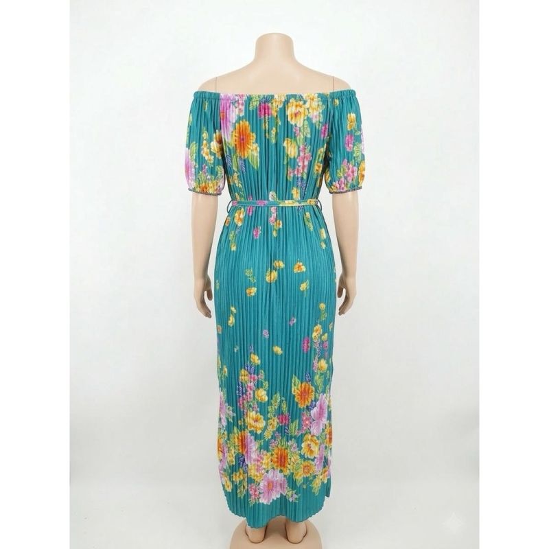 Teal Pleated Off-Shoulder Floral Maxi Dress with Belt