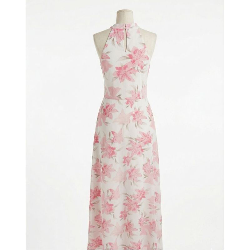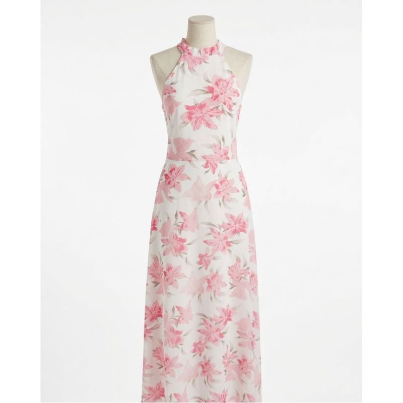 White Halter-Neck Maxi Dress with Pink Floral Lily Print