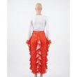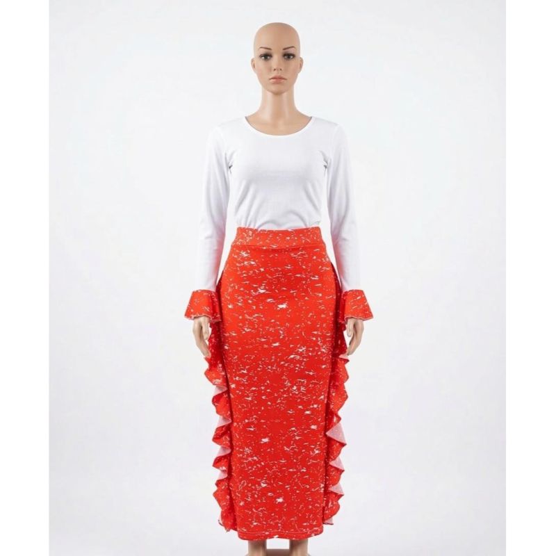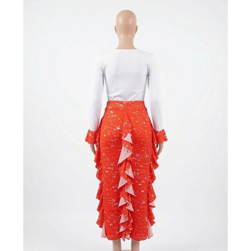 White Long-Sleeve Ribbed Top and Orange Speckled Ruffle-Trim Skirt Set