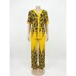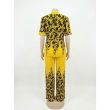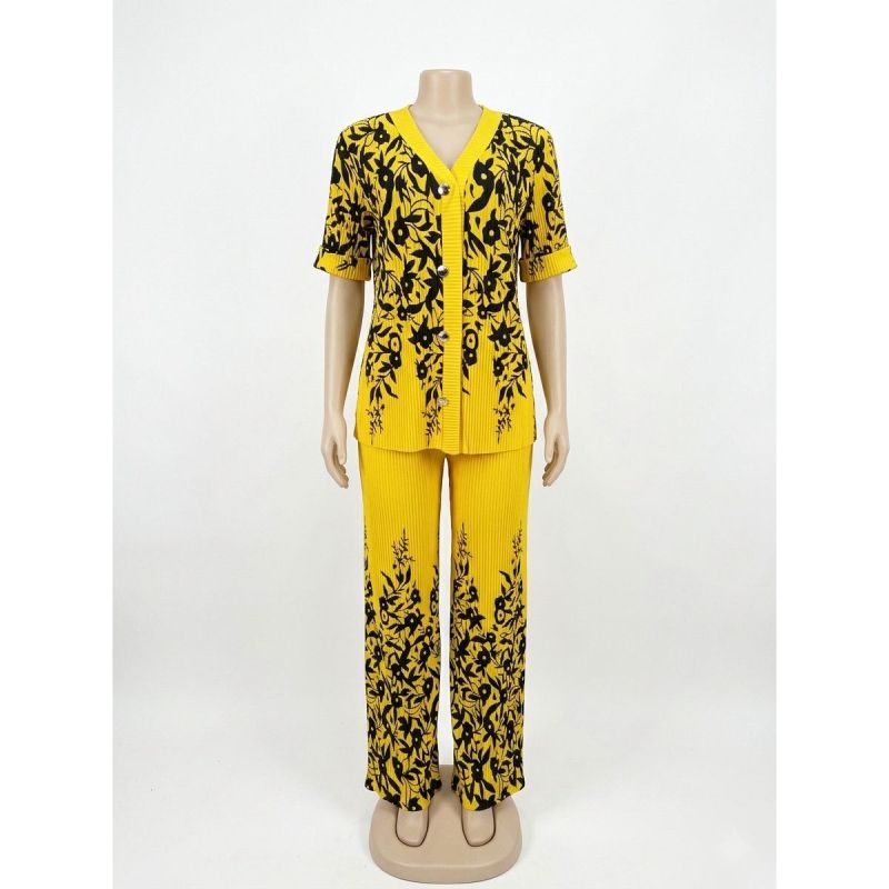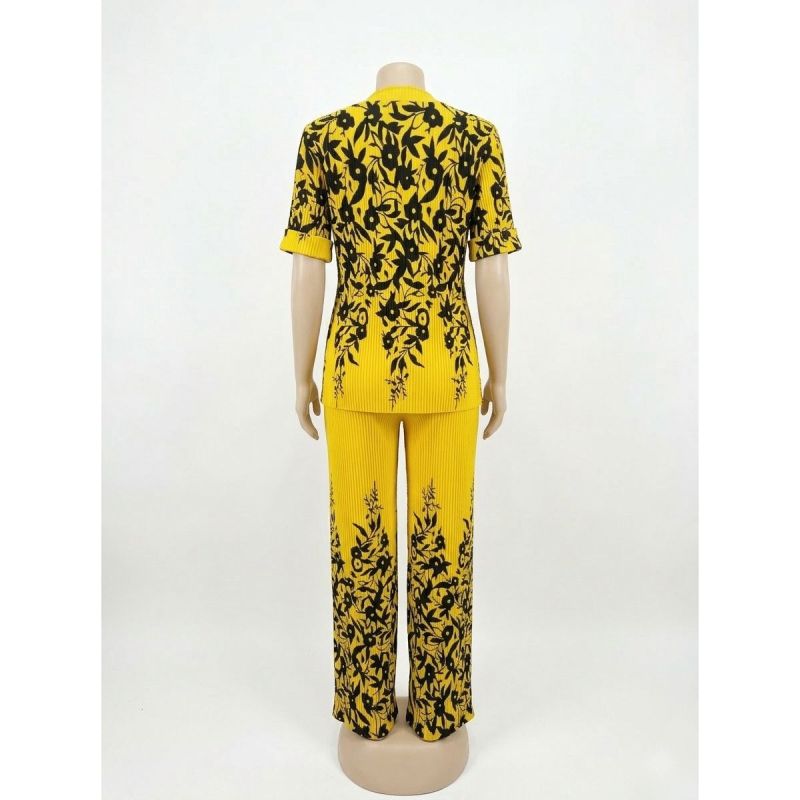 Yellow Floral Print Ribbed Short-Sleeve Button-Up Top and Trousers Set